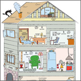 Often referred to as the masterpiece on the city's website, also known as the Mouse House, this illustration shows the potential fire hazards within a typical North American house. It also shows what proper safety measures should be employed (illuminated sign displaying the street number, water tank straps, etc.). There are a few PDF versions provided on the page (one coloured and one black & white) so that employees in daycare and community centres, as well as libraries can print them up and offer children the possibility of colouring while learning about fire safety.